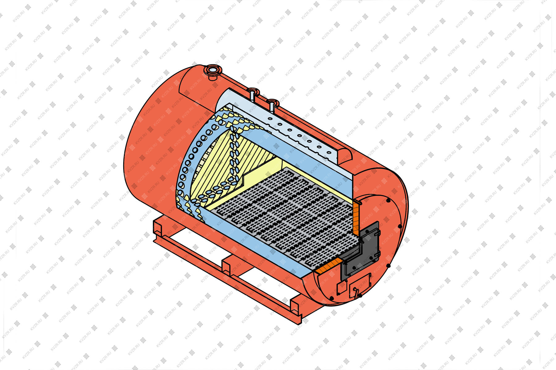 На боковой части корпуса внизу у котла имеется ревизия с крышкой, для периодического осмотра состояния поверхностей нагрева со стороны водяного объема.